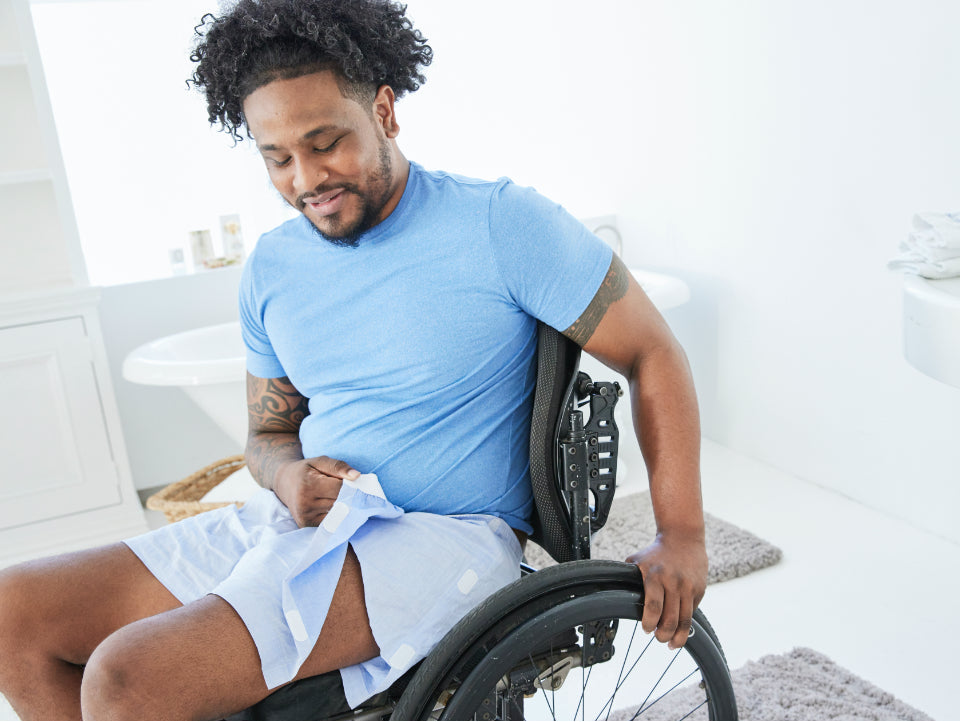 Most people don’t think much about going to the bathroom. But if you have a disability it can be a challenge. You may rush to get there in time, or struggle managing the toilet and your clothes. That’s why our pull-off Velcro flap is so easy - just pull off the front, move it aside, and tuck it in the waist strap to keep it out of the way.